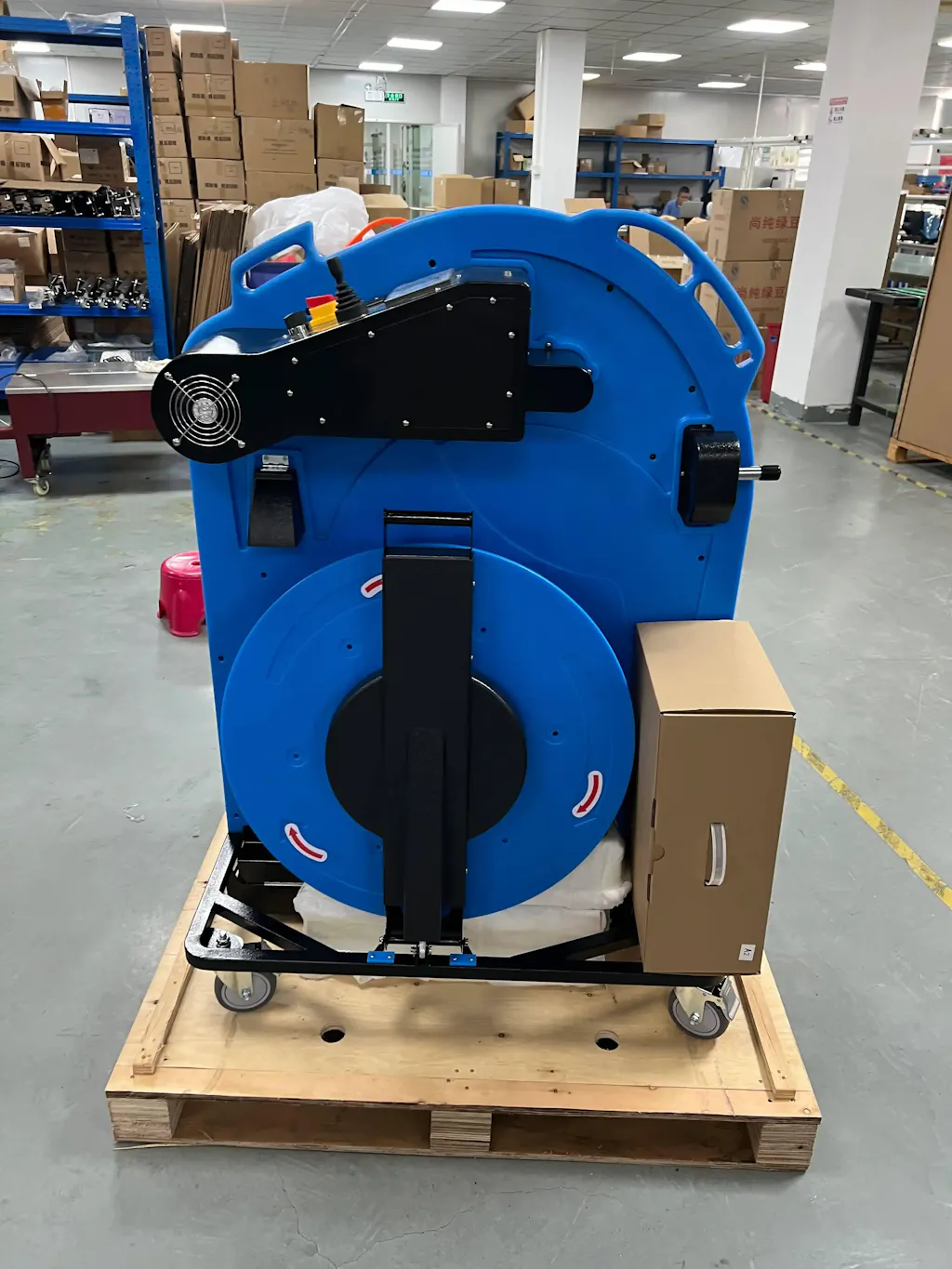 This is a pallet strapping cart. It can automatically wrap the pallet without bend overs, which is safe for operators. It is suitable for PP and PET strap.