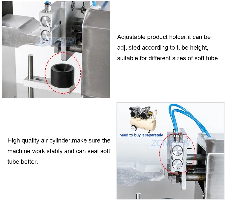 Esta máquina es adecuada para sellar tubos blandos como pasta de dientes, crema solar, crema para manos, champú, etc. Tiene función de corte, que puede cortar el tubo innecesario después del sellado. La máquina puede equiparse con un codificador de fecha, que puede ayudar a imprimir el lote o la fecha de producción en el tubo. Ahorre costos de mano de obra y mejore la eficiencia del trabajo.
