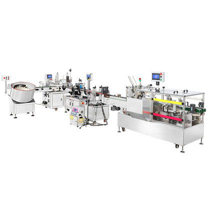 This is an automatic liquid packaging line integrated bottle unscrambling, filling, capping, labeling, coding and cartoning. It is cost-effective and labor-saving. It is widely used in the liquid bottling industries.