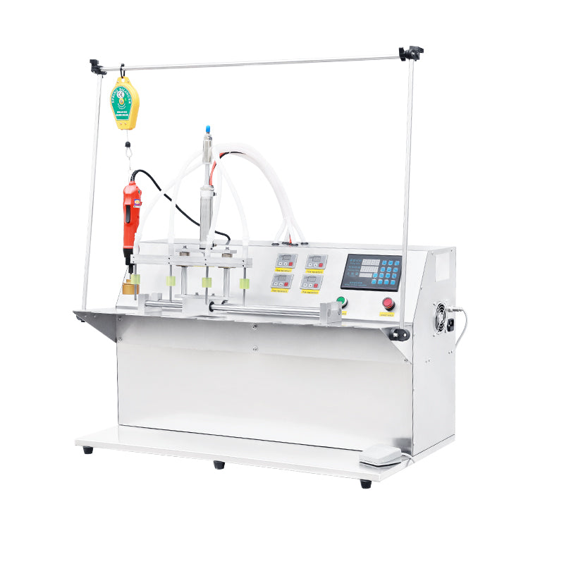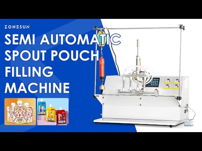 This is a semi-automatic spout pouch filling and capping machine. It is designed with a platform holding the bags. The machine features a 4-head filling design, allowing simultaneous filling of four pouches at a time. After filling, the operator manually places the caps onto the pouches and uses a manual capping machine to securely seal the spouts.