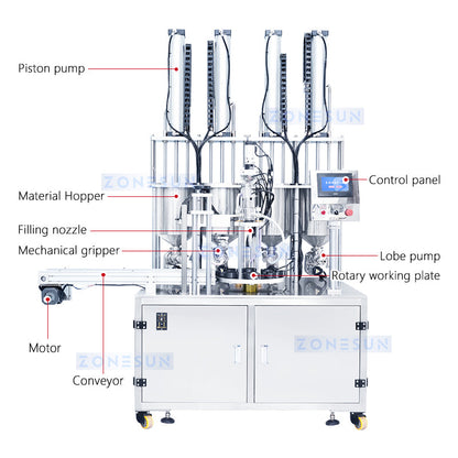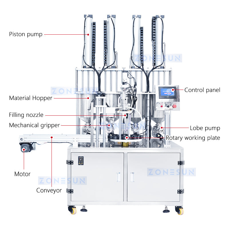 The ZONESUN ZS-VTRPF4 is an automatic rotary 4-color filling machine designed to fill multi-color creams evenly into bottles or jars. With four rotary filling heads, it is ideal for producing cosmetic creams, whipped body butters, and colorful food pastes. Suitable for 5–100ml filling, this machine is widely used in cosmetics, food, and daily chemical industries.
