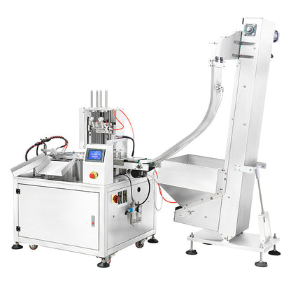 Revolutionize your capping process with our high-speed, dual-lane wad inserting machine. This innovative machine seamlessly integrates a cap elevator for efficient feeding, guiding caps through dual-lane tracks to a rotary star wheel design. Each stage operates with dual work stations for maximized output. A precise sensor system detects each cap before wad insertion, ensuring only properly positioned caps receive aluminum foil liners. Our double-headed wad placement mechanism accurately inserts pre-cut wads from magazines. Caps lacking wads are reliably rejected via a rejection chute. Achieve speeds of 60-80 caps per minute with this robust, customizable machine, ideal for flat caps. Conical caps require a vibratory bowl feeder (available as an add-on).