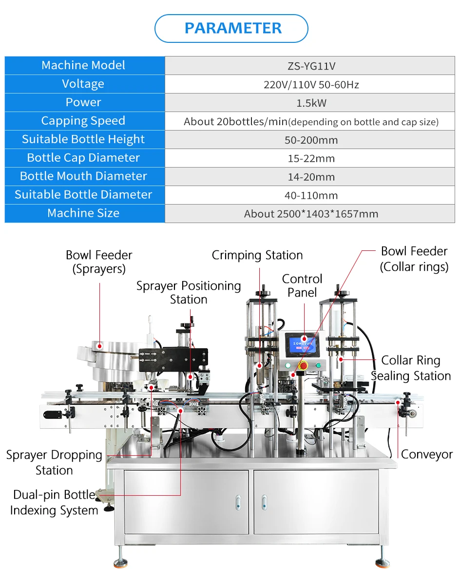 This perfume capping machine is suitable for two kinds of bottle caps,the pressing type and the crimping type.It can also be used to cap collar ring.It can work with automatic filling machine to realize automated production,and change the capping mold,it can be used for different sizes of bottles.